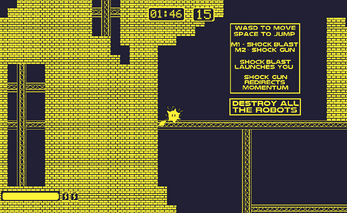In this game you destroy robots as fast as possible. Move around quickly by abusing the launch power of your ShockBall and Momentum Redirection of the ShockGun. You may need multiple tries to learn where the robots are and plan a route.